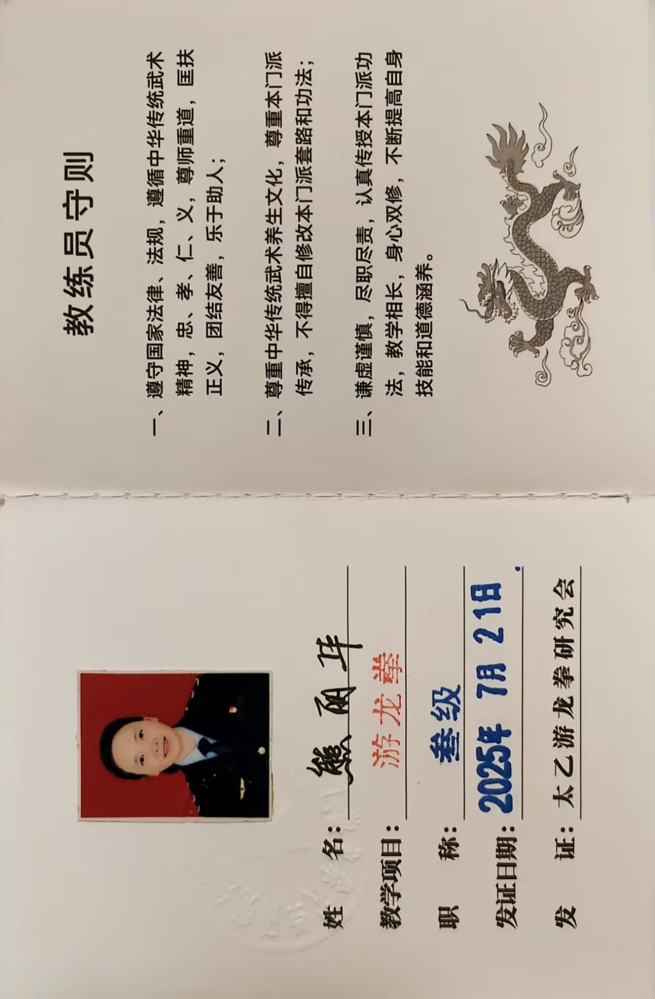 熊丽华 女 1969年3月出生,湖北宜昌兴山人,湖北省武术协会会员,中国武术四段,社会体育二级指导员,多年习练陈氏太极拳,持陈家沟太极拳功夫学校颁发《陈家沟太极拳教练资格证书》。2年前一次偶然的机会结识一位年长的拳友并经他的极力推荐接触太乙游龙拳第十二代传承人余安仁掌门的太乙游龙拳,每曰练完陈氏拳后就跟着拳友学习游龙拳,起初是因练完游龙拳后不觉累反感到轻松才慢慢坚持下来,后来便沉迷其中并一发不可收拾,先后线上上了李丹老师的筑基班,洪虹老师的进段班,结业后于25年7月不畏高温酷暑又追根溯源到湖南长沙发源地线下学习,得到洪虹,李菲,张藉文三位老师的精心教授,更有幸的是受到余安仁老掌门的悉心教导,受益匪浅。每次练完龙功之后,身心愉悦,经脉畅通,元气满满。25年考得由余老掌门亲手颁发的《太乙游拳教绿证》。25年7月加入游龙拳协会会员借用拳友的一道游龙来形容再适当不过。太乙真形化游龙,